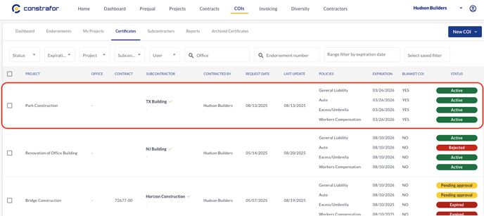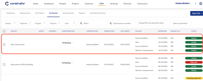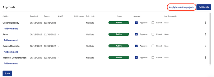 Once you have an approved Blanket COI for a subcontractor, you can then apply it to other COI requests for that subcontractor.