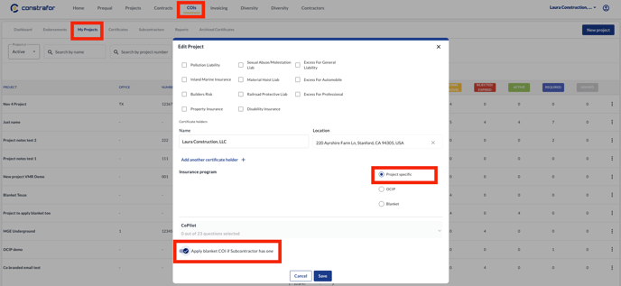 2. Then, ensure that the project to which you are trying to apply the blanket has a "Project specific" insurance program and that the toggle for "Apply blanket COI if subcontractor has one" is on. Navigate to COIs --> My Projects and click on the project of interest to view these project settings.
