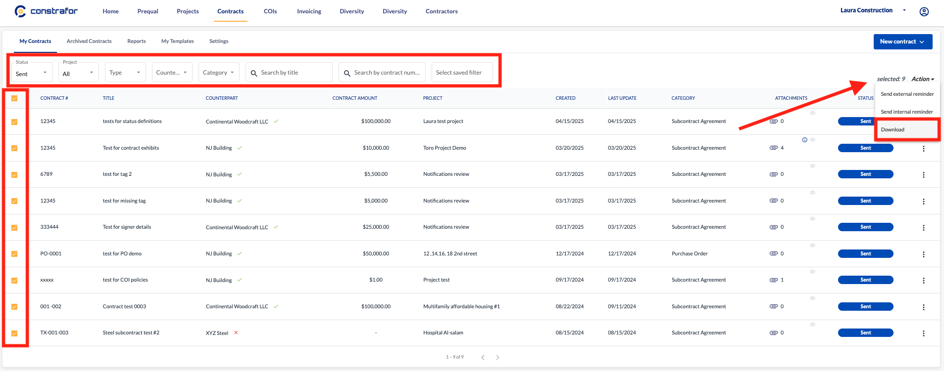 If you wish to download several contracts at once, you can use Constrafor's bulk action feature.