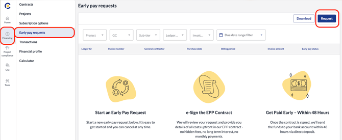 Then, click Early Pay Requests from the menu that appears just to the right of that sidebar and finally, click Request all the way of the right side of the page.