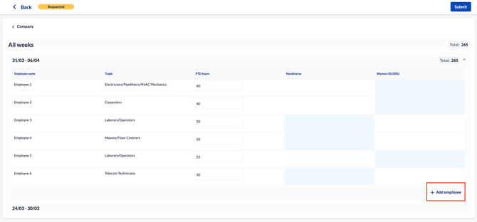 - As you add employees, you'll see them appear on this table and you will be able to enter the hours they worked that week. When you're done, click "Submit" at the top right corner of your screen.