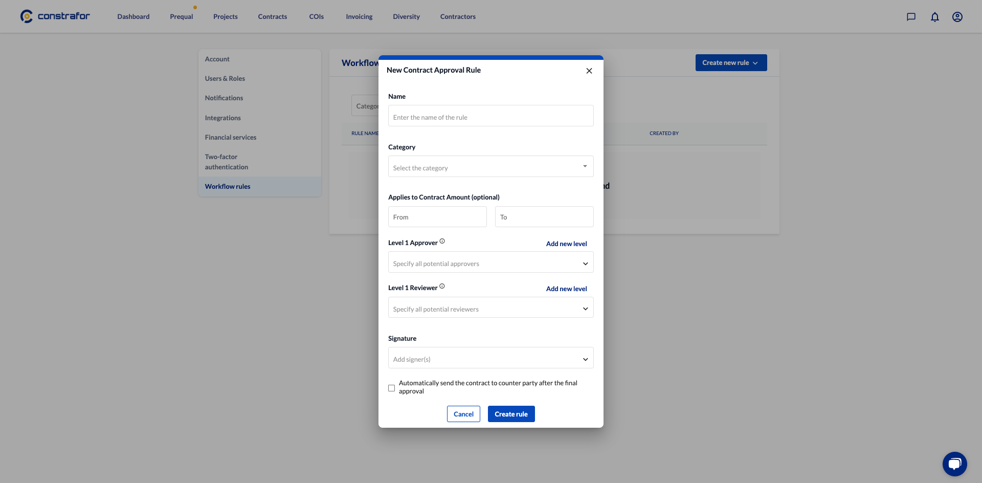 4. Click on Create new rule, then select Contract, Invoice, or SOV approval.