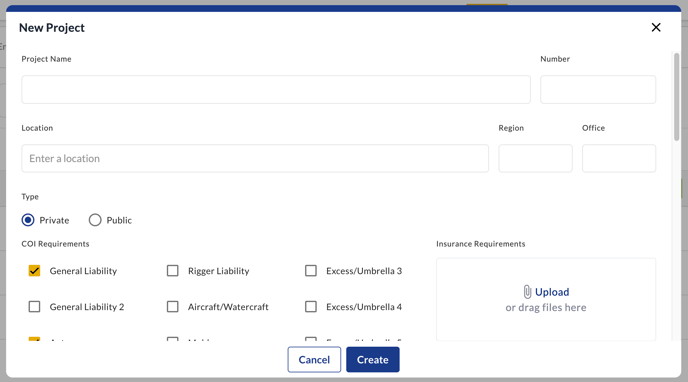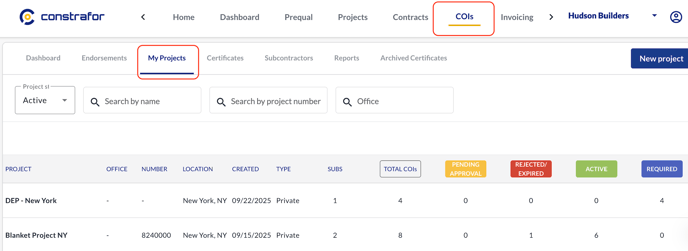 - Head to the My Projects tab in the COI module and click the New Project button on the right.
