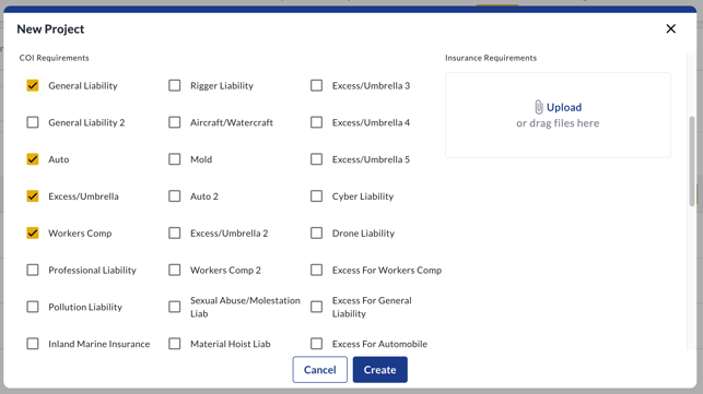 - Next, select all policies that are required for this project and provide any project-specific insurance requirements