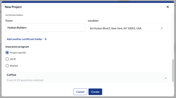 - The certificate holder will automatically be filled in with your company's information. If you'd like to include additional certificate holders, click Add another certificate holder +. Next, select what type of project this is: Project-specific, OCIP, or Blanket. Then click Create.