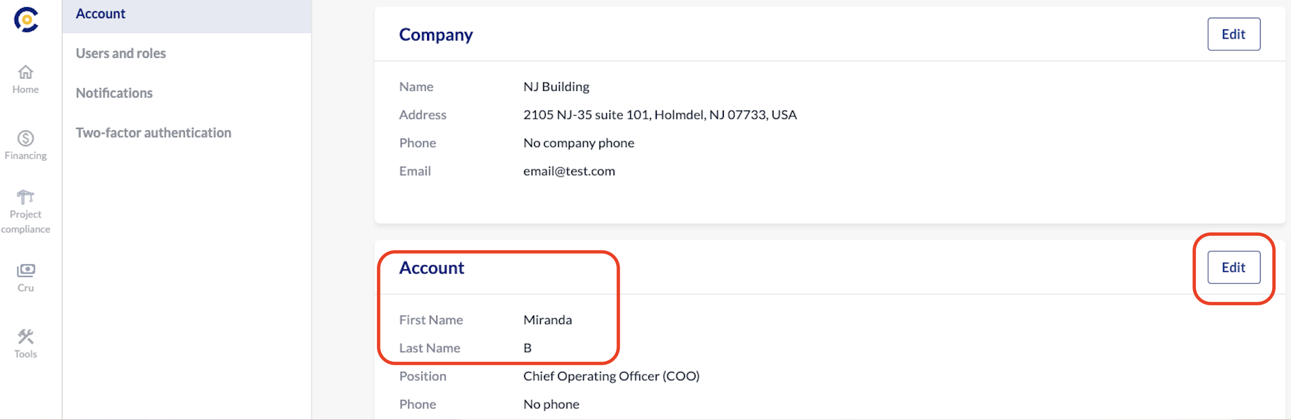 Important note: If you are having trouble signing your contract, please check to make sure your first/last name is on your Constrafor account. You can check this by navigating to the Settings by clicking the Account icon in the lower left corner of the page and clicking Settings. There you will find your personal account settings where your name will be. Click the Edit button on the right if you find your name is missing and click Save when finished. Then go back to sign the contract.